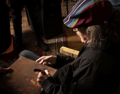 León Gieco Sobre el arte gráfico, recordó: “La tapa, en realidad, éramos nosotros en la ventana. Después fue idea de Charly sacarnos y usar esa imagen como tapa”. Charly remató, sonriendo: “Está buena la tapa”. Sobre el día que sacaron la foto, dijo “Ni bien entramos al pueblo, había un cartel que decía: Vino de mesa Mestre”. |